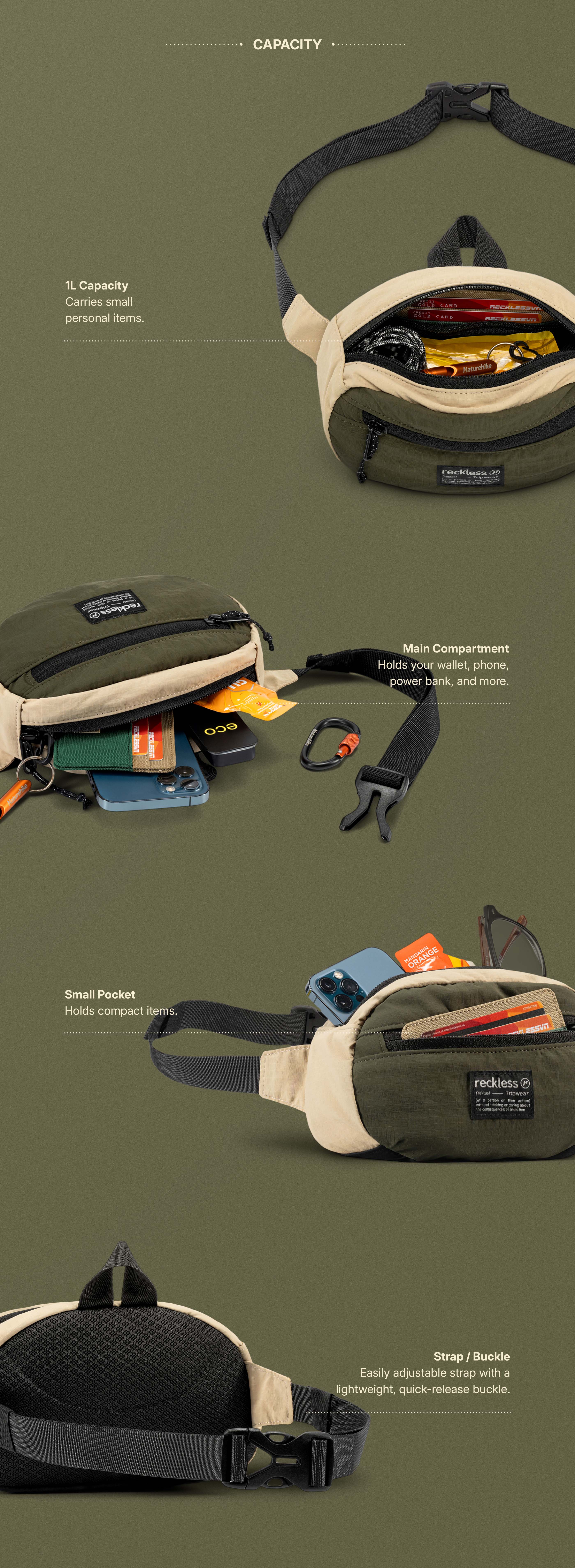 - - Ideal for activities like cycling and walking. Allows quick access to items without taking off your backpack; can hold small survival tools when trekking or hiking